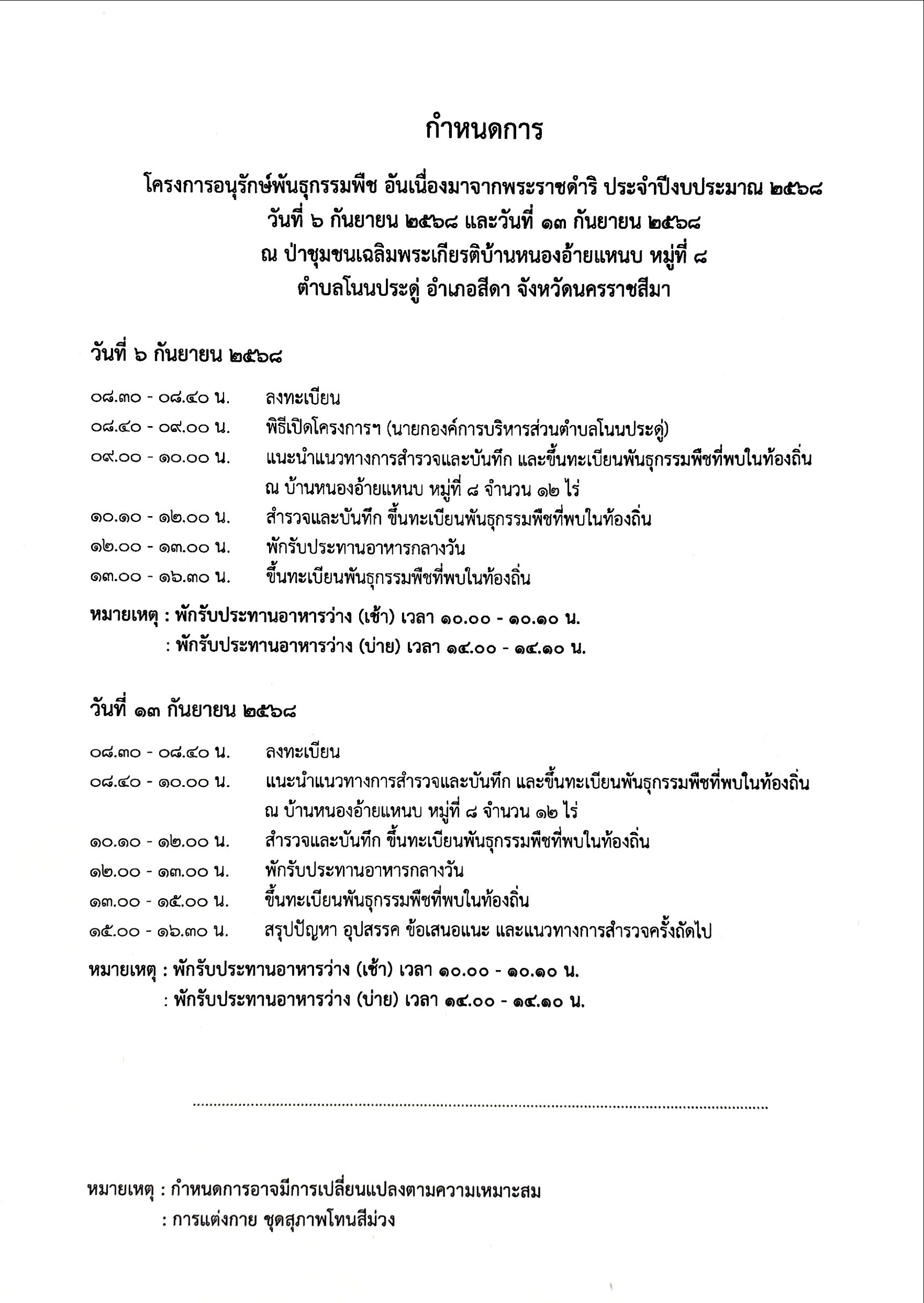 ในวันเสาร์ ที่ 6 กันยายน พ.ศ.2568 ตั้งแต่เวลา 08.30 น. เป็นต้นไป ณ ป่าชุมชนเฉลิมพระเกียรติบ้านหนองอ้ายแหนบ หมู่ที่ 8 ตำบลโนนประดู่ อำเภอสีดา จังหวัดนครราชสีมา