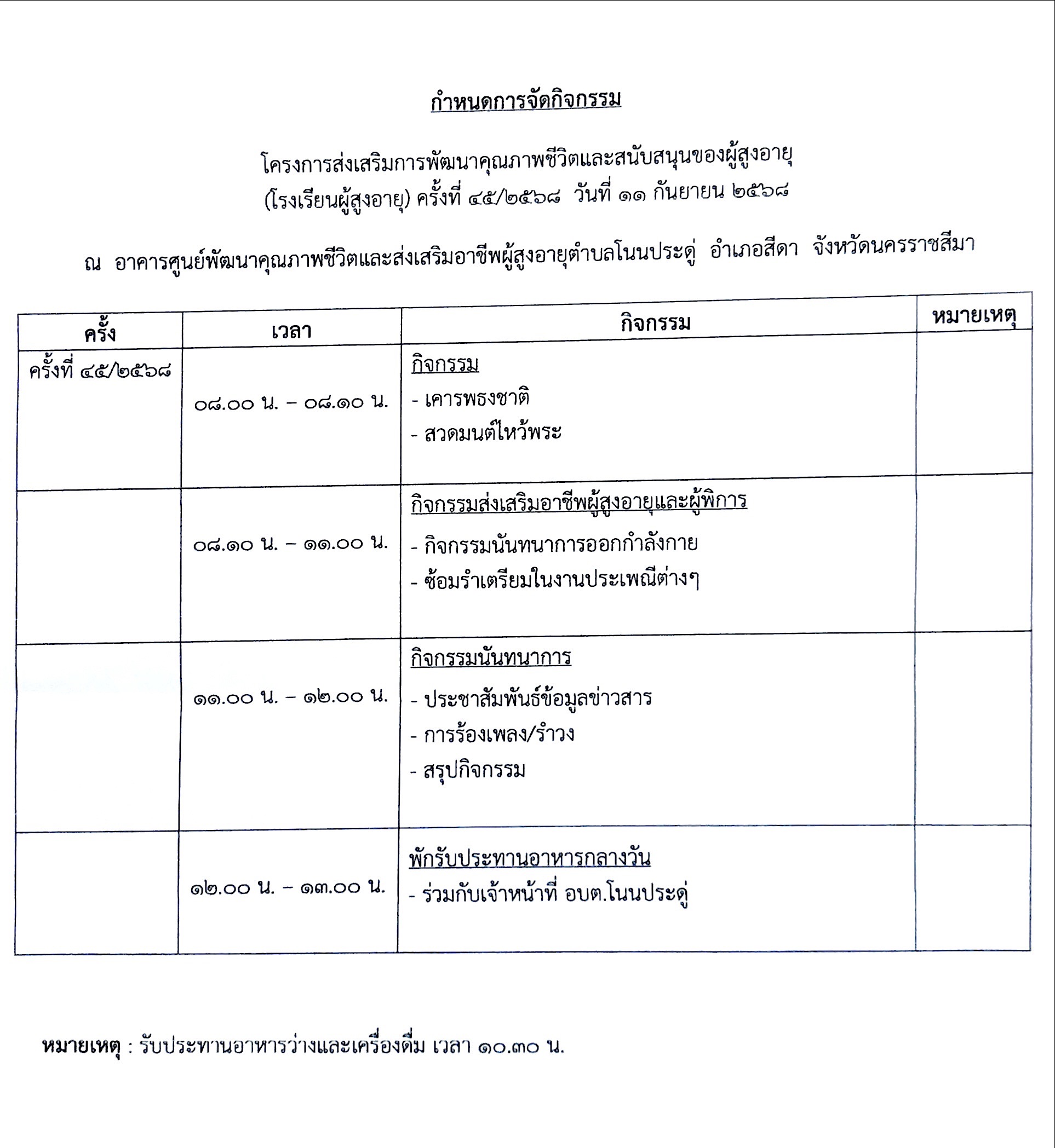ในวันที่ 11 กันยายน 2568 ตั้งแต่เวลา 08.30 น .เป็นต้นไป โดยเป็นกิจกรรมส่งเสริมอาชีพ การเตรียมความพร้อมสู่วัยสูงอายุ การป้องกันโรคในวัยสูงอายุ และกิจกรรมนันทนาการเพื่อเป็นการผ่อนคลายความเครียดและให้ความบันเทิงแก่นักเรียนผู้สูงอายุตำบลโนนประดู่ ณ ศูนย์พัฒนาคุณภาพชีวิตและส่งเสริมอาชีพผู้สูงอายุตำบลโนนประดู่ อำเภอสีดา จังหวัดนครราชสีมา รายละเอียดตามกำหนดการที่แนบมาพร้อมนี้