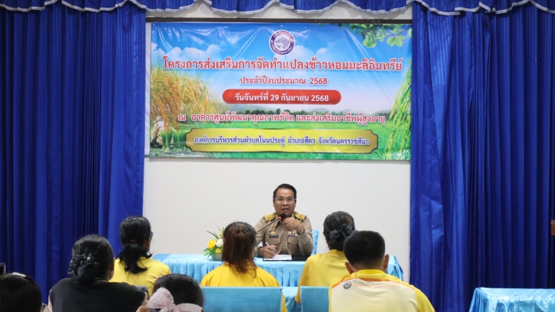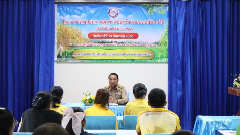 จัดโครงการส่งเสริมการจัดทำแปลงข้าวหอมมะลิอินทรีย์ ประจำปีงบประมาณ 2568 พร้อมด้วย เจ้าหน้าที่เกษตรอำเภอสีดา บรรยายให้ความรู้และสาธิตการทำสารชีวภัณฑ์ที่ใช้กำจัดโรคพืช เพื่อให้เกษตรกรในพื้นที่สามารถนำไปปรับใช้ได้อย่างเหมาะสมและสร้างความเข้าใจและเพิ่มศักยภาพแก่เกษตรกรในพื้นที่ ณ อาคารศูนย์พัฒนาคุณภาพชีวิตและส่งเสริมอาชีพผู้สูงอายุตำบลโนนประดู่ อำเภอสีดา จังหวัดนครราชสีมา