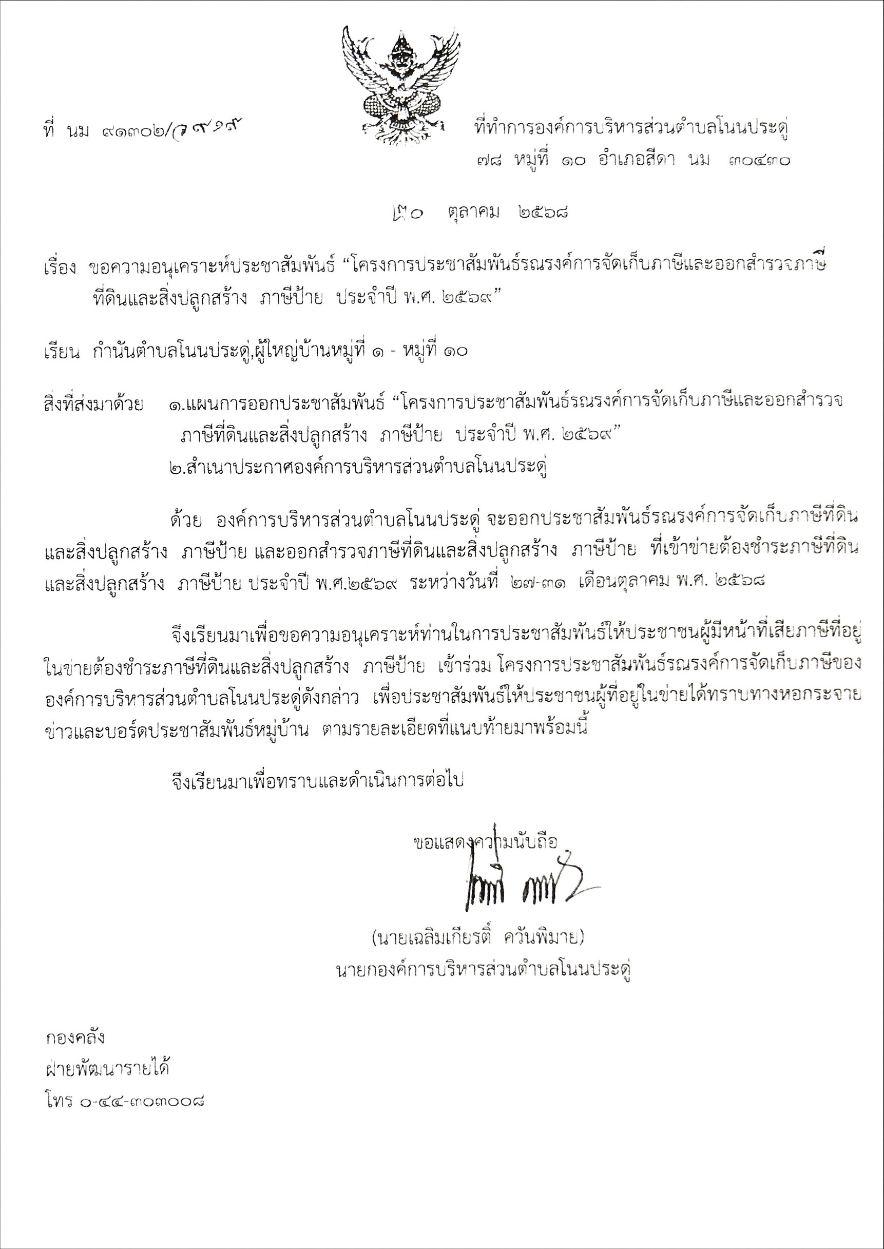 ขอความอนุเคราะห์ประชาสัมพันธ์ โครงการการประชาสัมพันธ์รณรงค์การจัดเก็บภาษีและออกสำรวจภาษีที่ดินและสิ่งปลูกสร้าง ภาษีป้าย ประจำปี 2569