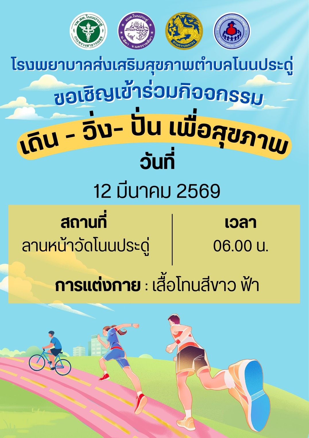 ขอเชิญ คณะผู้บริหาร พนักงาน อบต. ผู้นำชุมชนและประชาชนในพื้นที่ ร่วมกิจกรรม เดิน-วิ่ง-ปั่น เพื่อสุขภาพ ประจำปีงบประมาณ 2569