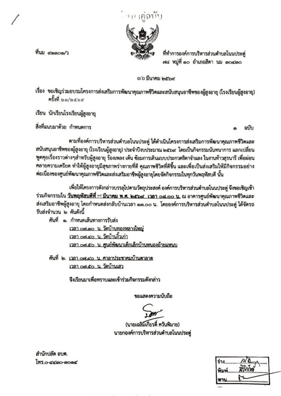 ขอเชิญเข้าร่วมโครงการส่งเสริมการพัฒนาคุณภาพชีวิตและสนับสนุนอาชีพของผู้สูงอายุ (โรงเรียนผู้สูงอายุ) ครั้งที่ 21/2569