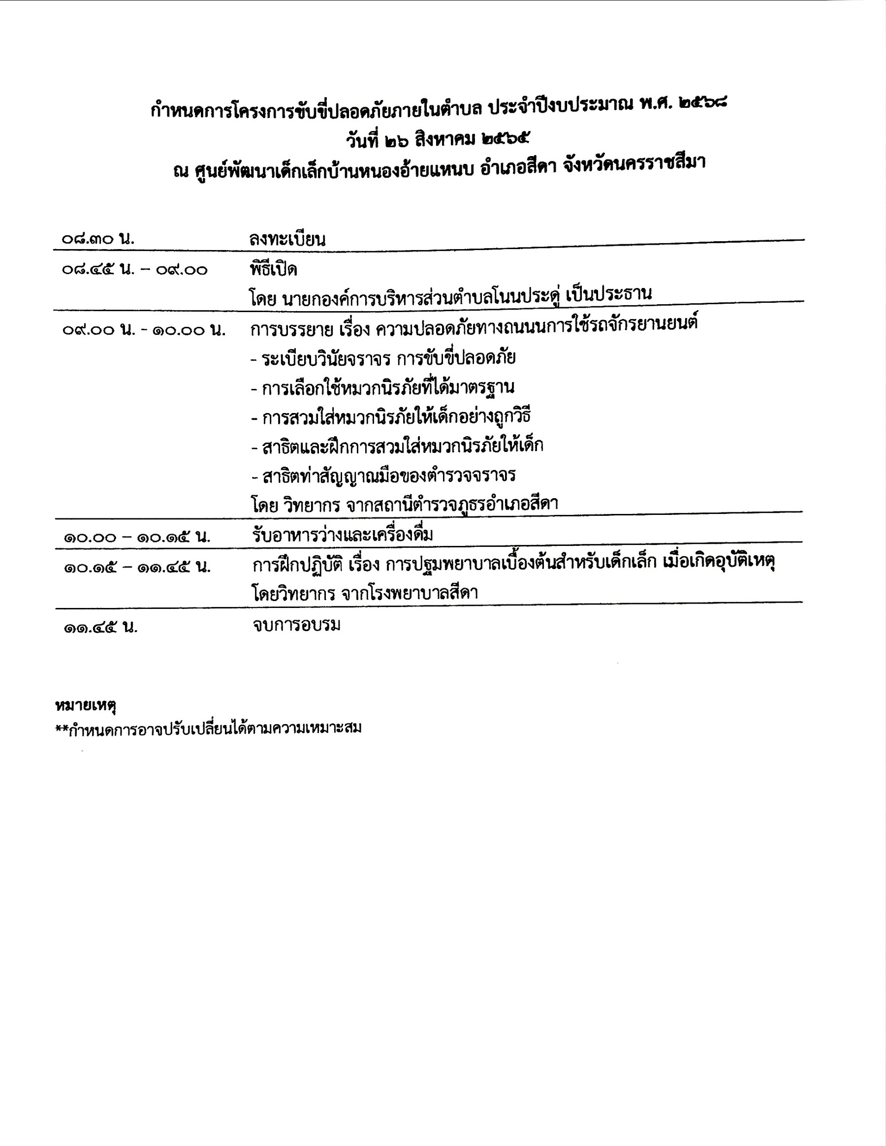 ขอเชิญ สมาชิกสภาองค์การบริหารส่วนตำบลโนนประดู่ /กำนัน/ผู้ใหญ่บ้าน/ผู้นำชุมชน/พนักงานจ้าง อบต.โนนประดู่ และประชาชนในเขตพื้นที่ตำบลโนนประดู่ ขอเชิญเข้าร่วมโครงการรณรงค์ขับขี่ปลอดภัยภายในตำบล ประจำปีงบประมาณ พ.ศ.2568 ในวันที่ 26 กันยายน 2568 ตั้งแต่เวลา 08.30 น. เป็นต้นไป ณ ศูนย์พัฒนาเด็กเล็กบ้านหนองอ้ายแหนบ ตำบลโนนประดู่ อำเภอสีดา จังหวัดนครราชสีมา รายละเอียดตามกำหนดการที่แนบมาพร้อมนี้