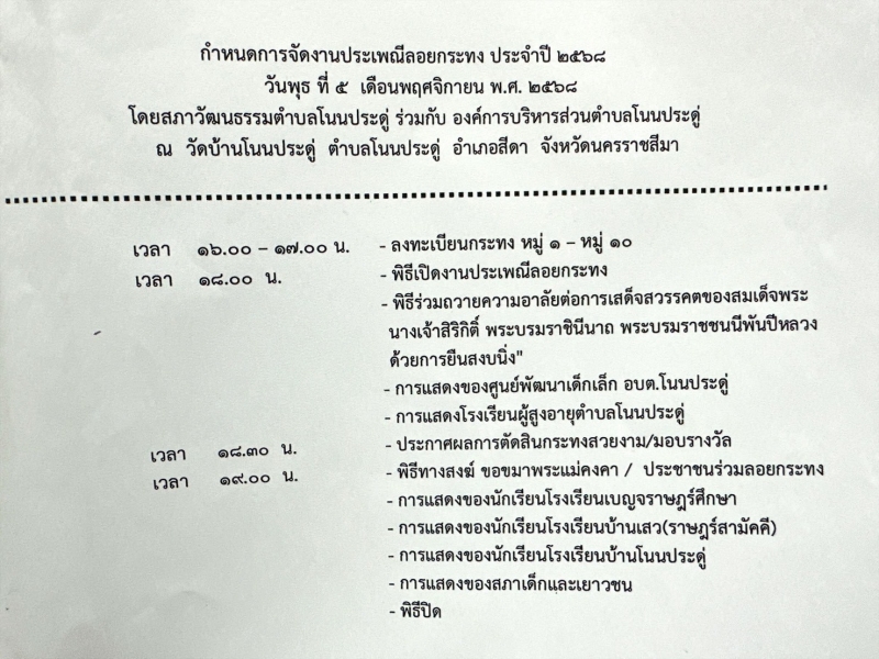 ขอเชิญ ร่วมงานประเพณีลอยกระทง ประจำปี 2568 ในวันพุธที่ 5 พฤศจิกายน 2568 ตั้งแต่เวลา 16.00 น.เป็นต้นไป ณ ลานสาธารณะประโยชน์หน้าวัดบ้านโนนประดู่ อำเภอสีดา จังหวัดนครราชสีมา ร่วมชมการประกวดกระทงสวยงามและการแสดงต่างๆมากมาย เพื่อเป็นการอนุรักษ์สืบสานงานวัฒนธรรมประเพณีประจำท้องถิ่นอันดีงามของไทยให้ดำรงสืบต่อไป รายละเอียดตามกำหนดการที่แนบมาพร้อมนี้