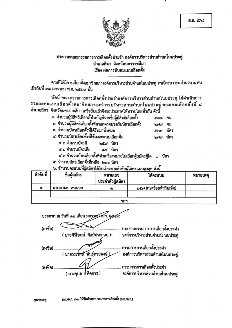 ประกาศผู้อำนวยการการเลือกตั้งประจำองค์การบริหารส่วนตำบลโนนประดู่ เรื่อง ผลการนับคะแนนเลือกตั้ง