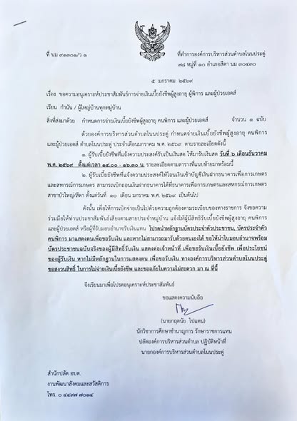 ขอความอนุเคราะห์ประชาสัมพันธ์ แจ้งการจ่ายเบี้ยยังชีพผู้สูงอายุผู้พิการ และผู้ป่วย HIV |