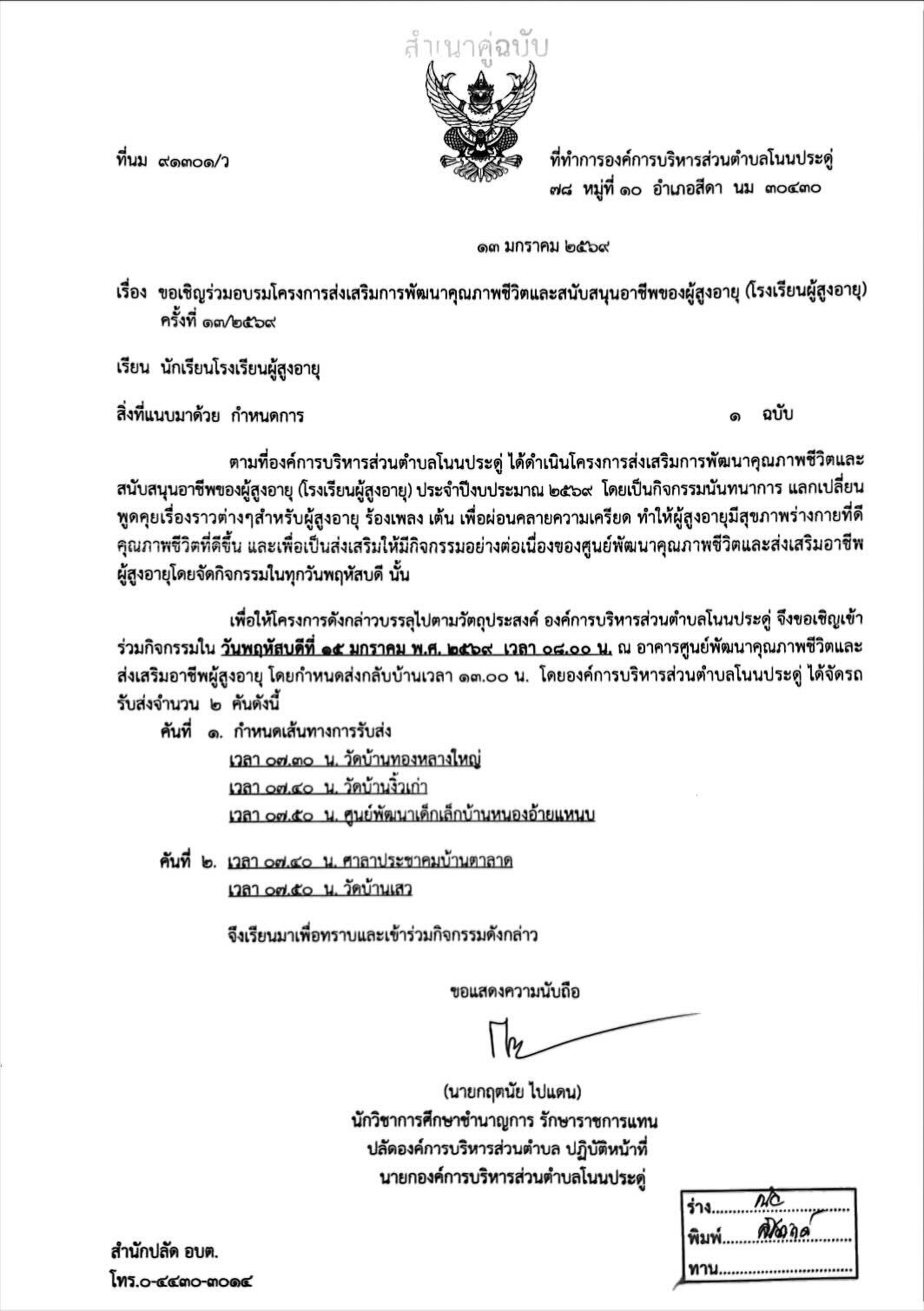 ขอเชิญเข้าร่วมโครงการส่งเสริมการพัฒนาคุณภาพชีวิตและสนับสนุนอาชีพของผู้สูงอายุ (โรงเรียนผู้สูงอายุ) ครั้งที่ 17/2569 |