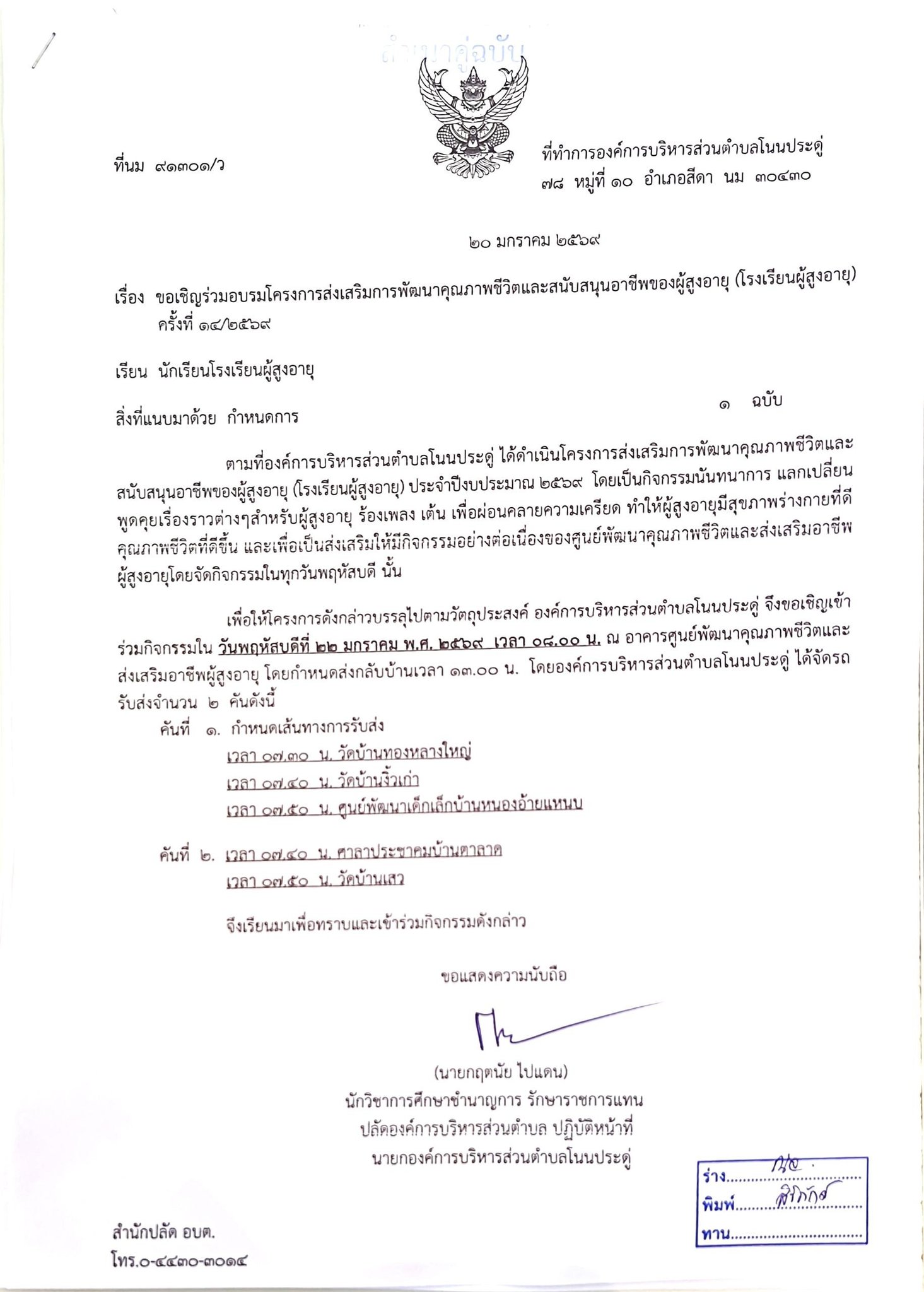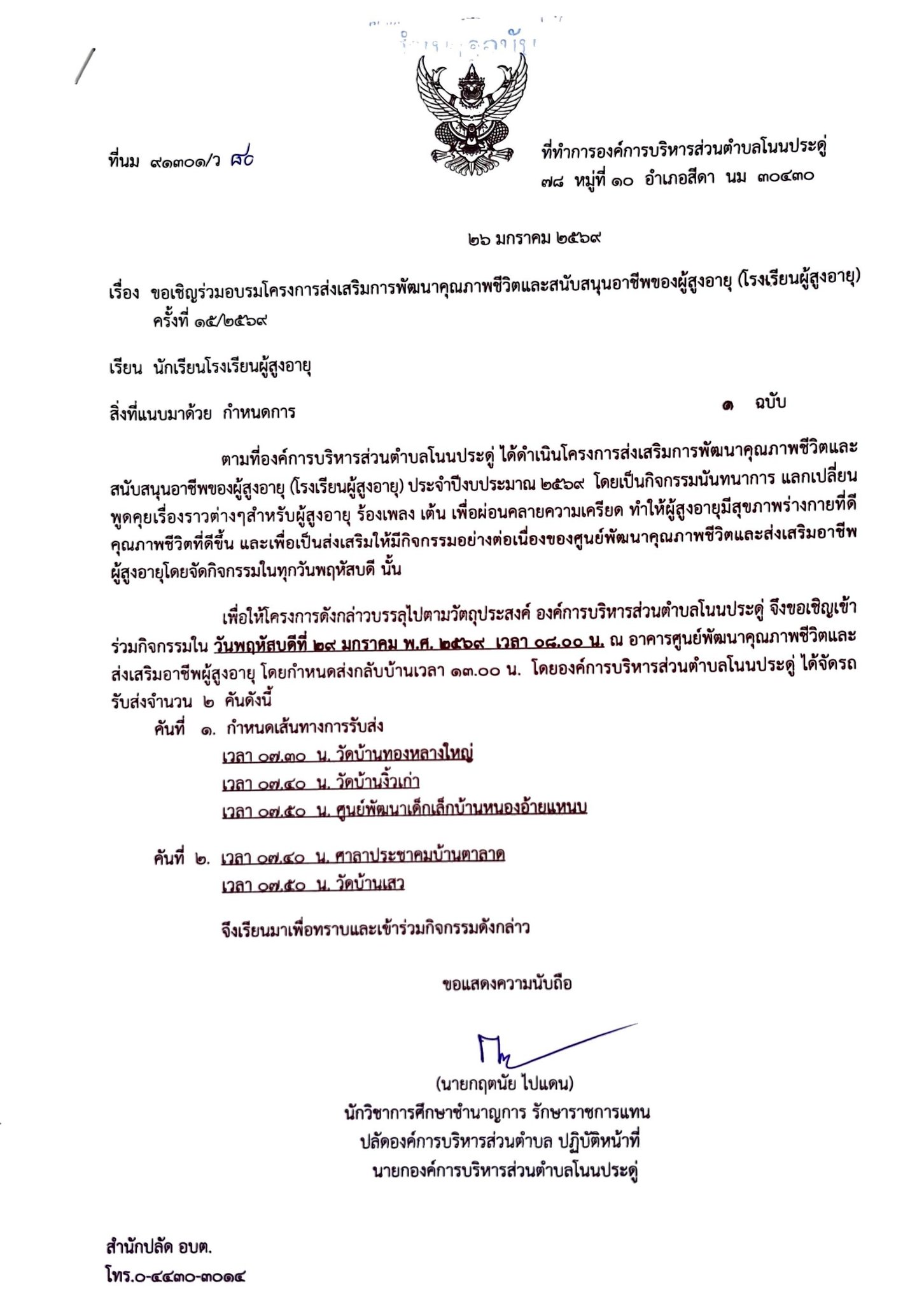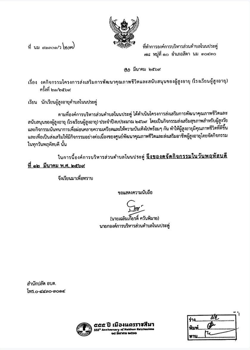 งดกิจกรรมโครงการส่งเสริมการพัฒนาคุณภาพชีวิตและสนับสนุนของผู้สูงอายุ (โรงเรียนผู้สูงอายุ) ครั้งที่ 21/2569 |