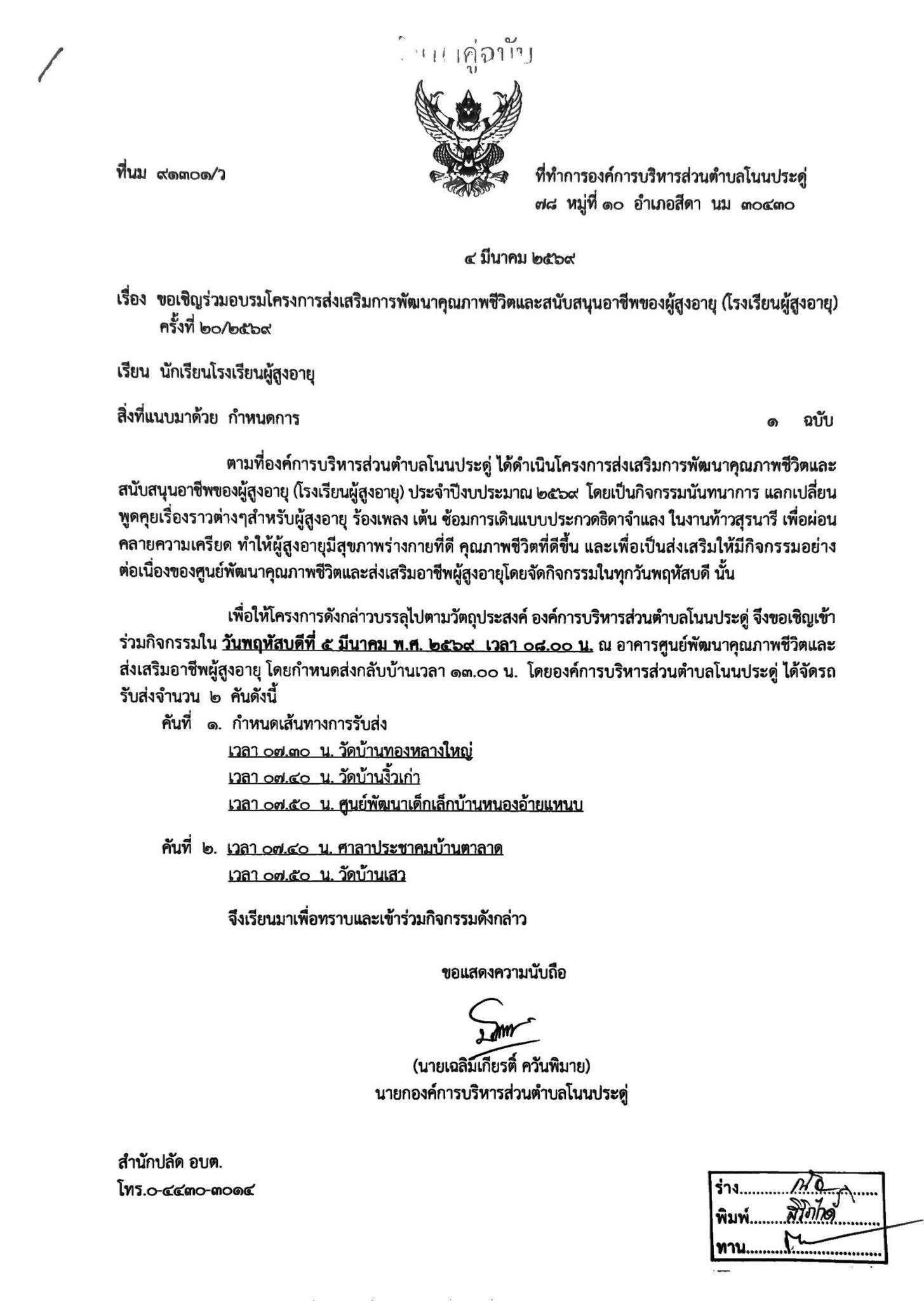 ขอเชิญเข้าร่วมโครงการส่งเสริมการพัฒนาคุณภาพชีวิตและสนับสนุนอาชีพของผู้สูงอายุ (โรงเรียนผู้สูงอายุ) ครั้งที่ 20/2569 |