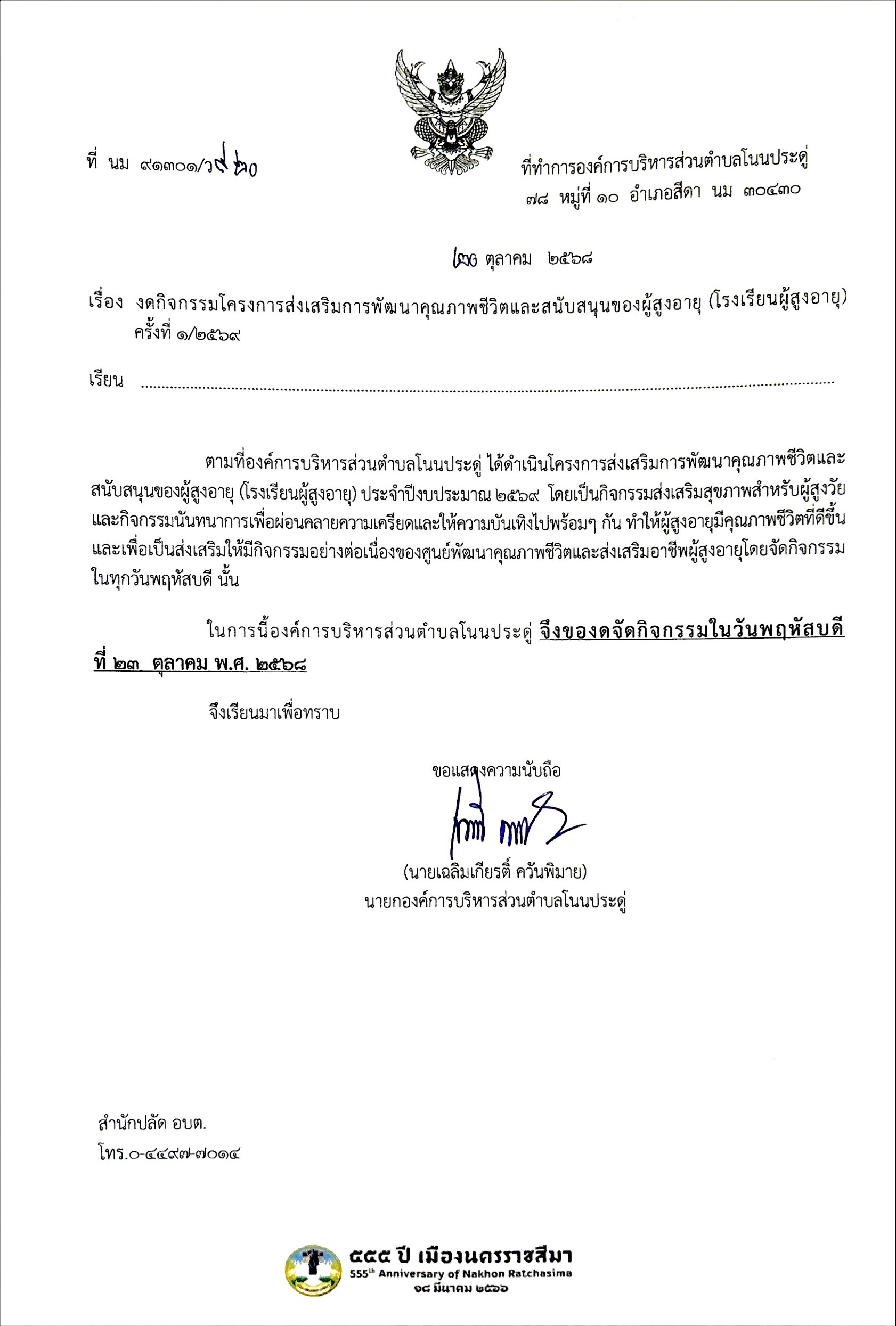 งดกิจกรรมโครงการส่งเสริมการพัฒนาคุณภาพชีวิตและสนับสนุนของผู้สูงอายุ (โรงเรียนผู้สูงอายุ)