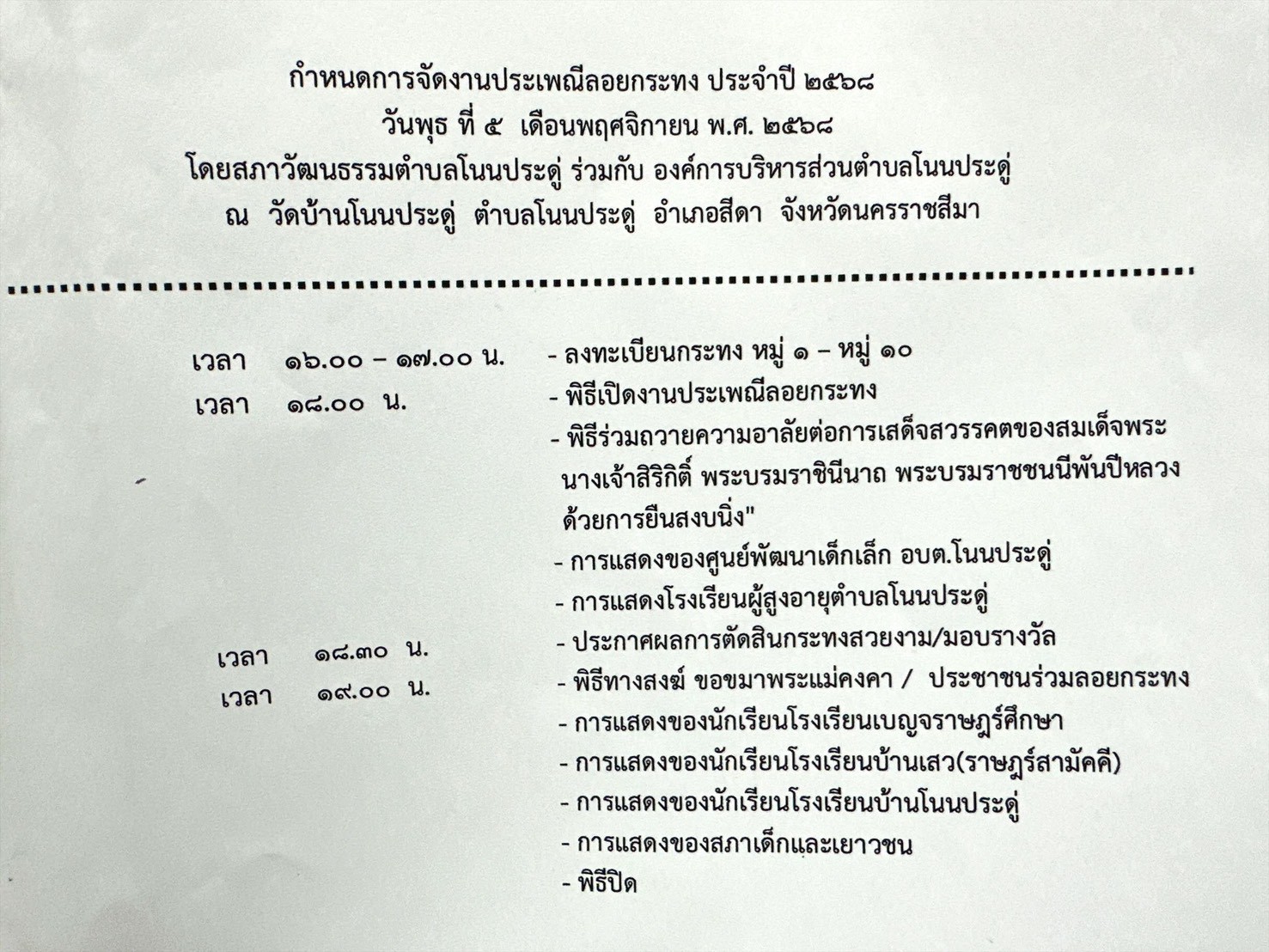 ขอเชิญ ร่วมงานประเพณีลอยกระทง ประจำปี 2568 ในวันพุธที่ 5 พฤศจิกายน 2568 ตั้งแต่เวลา 16.00 น.เป็นต้นไป ณ ลานสาธารณะประโยชน์หน้าวัดบ้านโนนประดู่ อำเภอสีดา จังหวัดนครราชสีมา ร่วมชมการประกวดกระทงสวยงามและการแสดงต่างๆมากมาย เพื่อเป็นการอนุรักษ์สืบสานงานวัฒนธรรมประเพณีประจำท้องถิ่นอันดีงามของไทยให้ดำรงสืบต่อไป รายละเอียดตามกำหนดการที่แนบมาพร้อมนี้